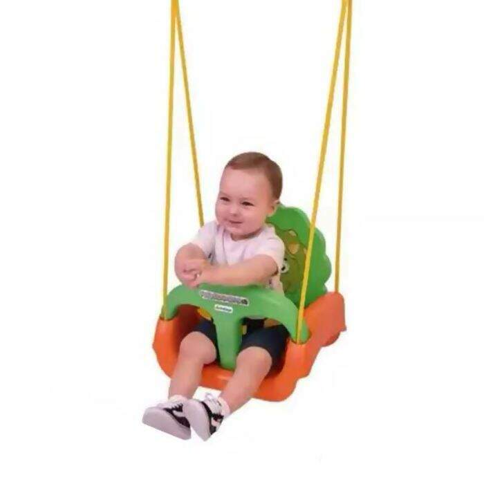Balanço injetado que acompanha o crescimento da criança. Com encosto regulável e barra de proteção. Acompanha cordas em plástico e 02 ganchos para fixação.