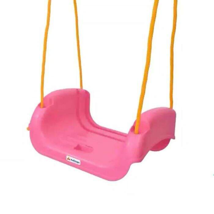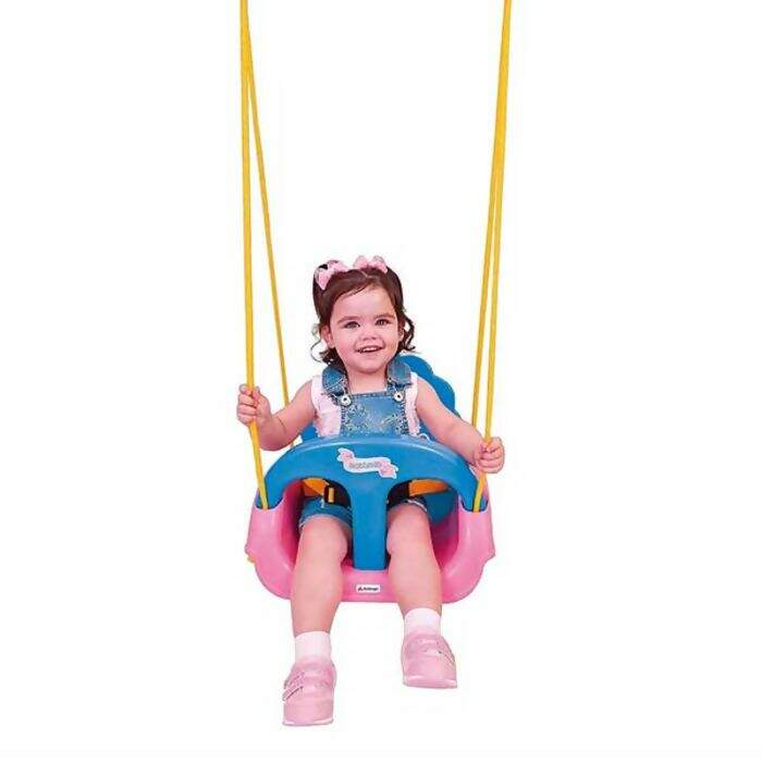 Balanço injetado que acompanha o crescimento da criança. Com encosto regulável e barra de proteção. Acompanha cordas em plástico e 02 ganchos para fixação.