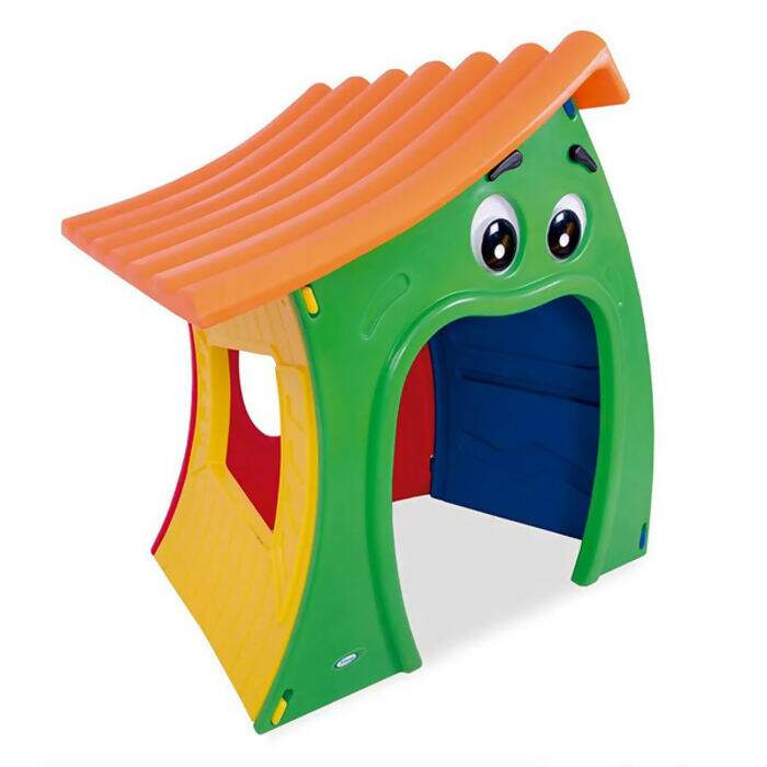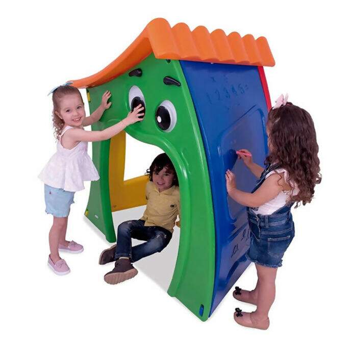 A Casinha Malukete Xalingo é diferentem, divertida e vem com várias atividades, seus olhos e sombrancelhas são móveis permitindo que a criança forme várias expressões, dentes basculantes e parede lateral com quadro para giz.