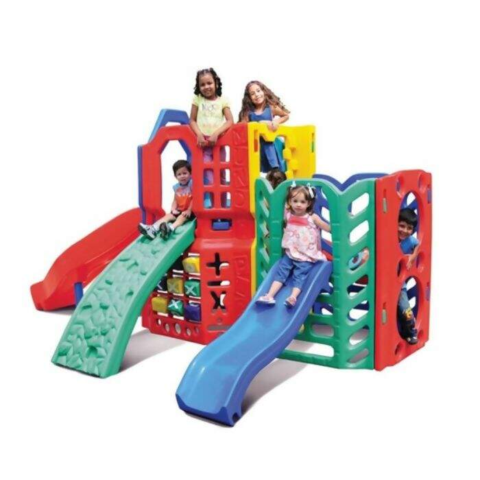 O Playground Mundi Play vem com escorregador grande com apoio de segurança, escalada, painel interativo, escalada e muito mais!